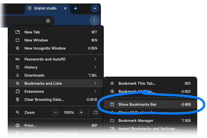 To turn on the bookmarks toolbar in Chrome, use Settings->Bookmarks and Lists->Show Bookmark Bar. (similar in Firefox)
